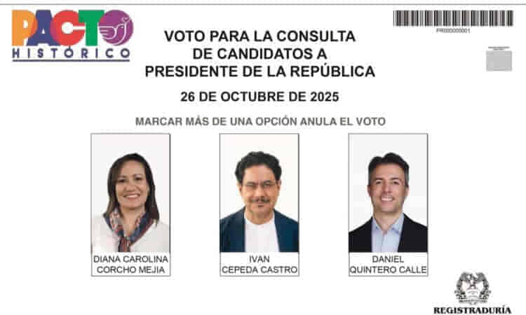 En los tarjetones figuran los nombres de Carolina Corcho, Iván Cepeda y Daniel Quintero, este último retirado de la contienda. Además, hay 144 aspirantes al Senado y 15 precandidatos a la Cámara, entre ellos Diana Carolina Mejía, Leyla Rincón y Dagoberto Quiroga.